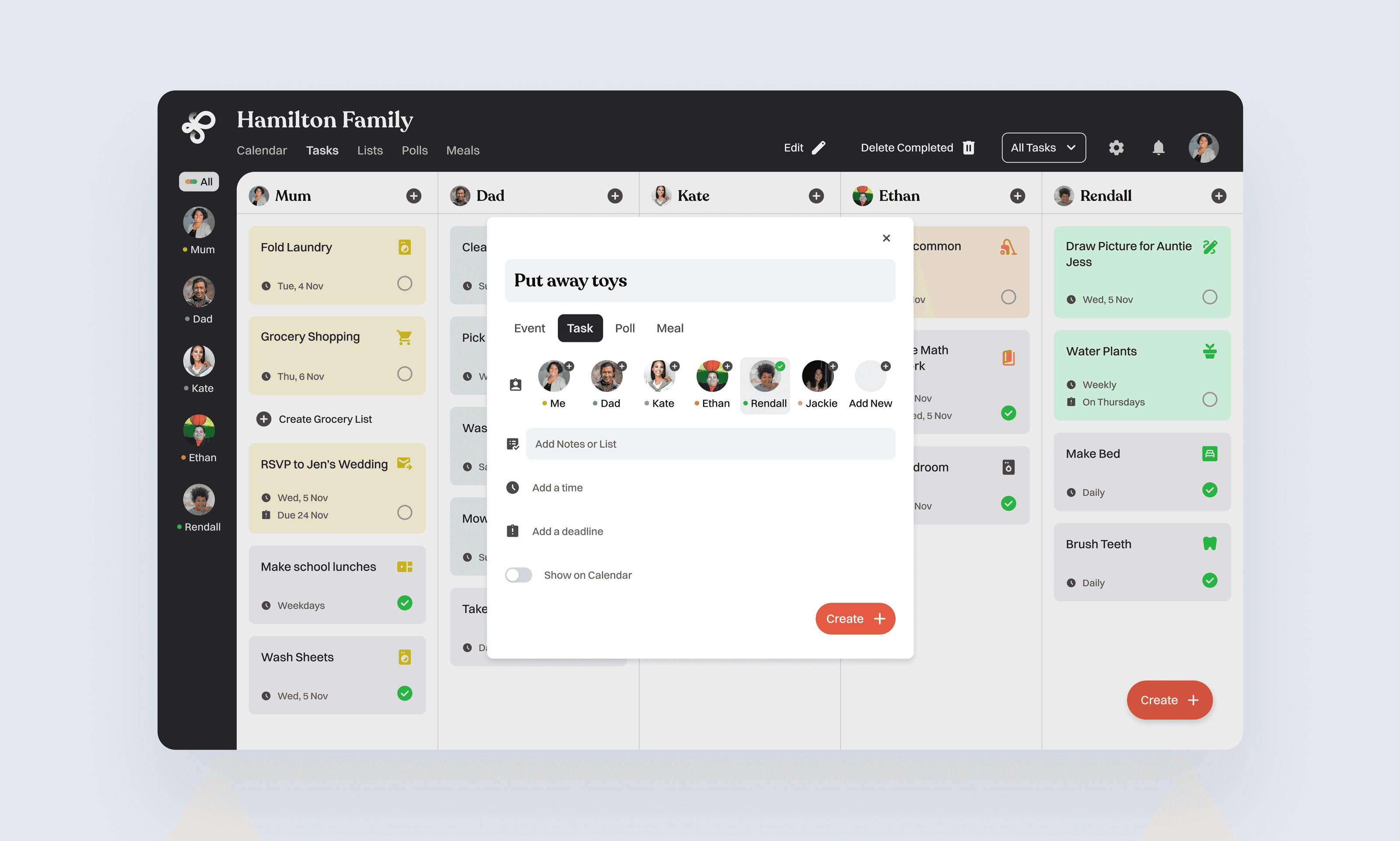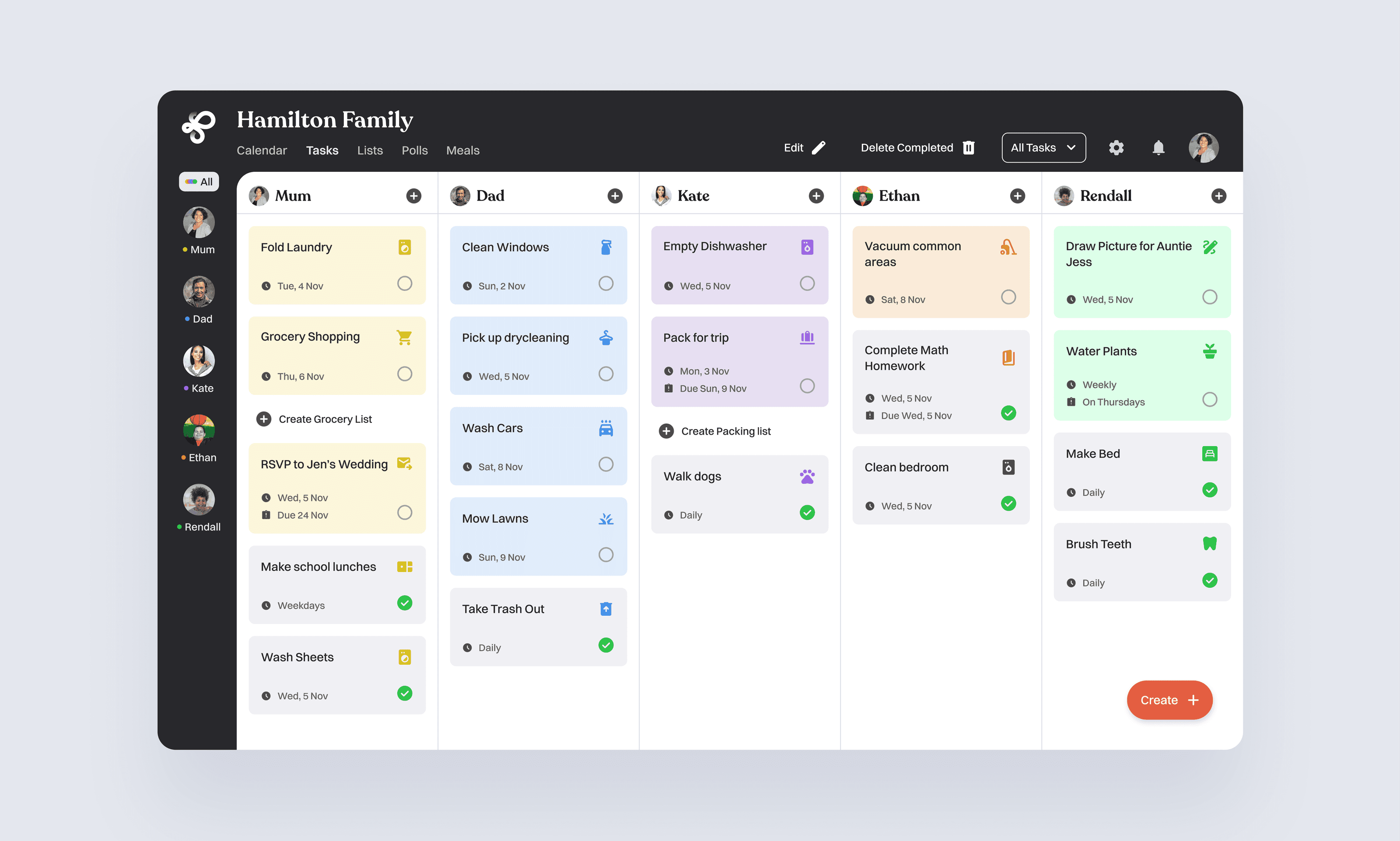 Parents can create and assign household tasks. Members can create their own tasks for independence. Completion states allow everyone to track progress and maintain accountability.