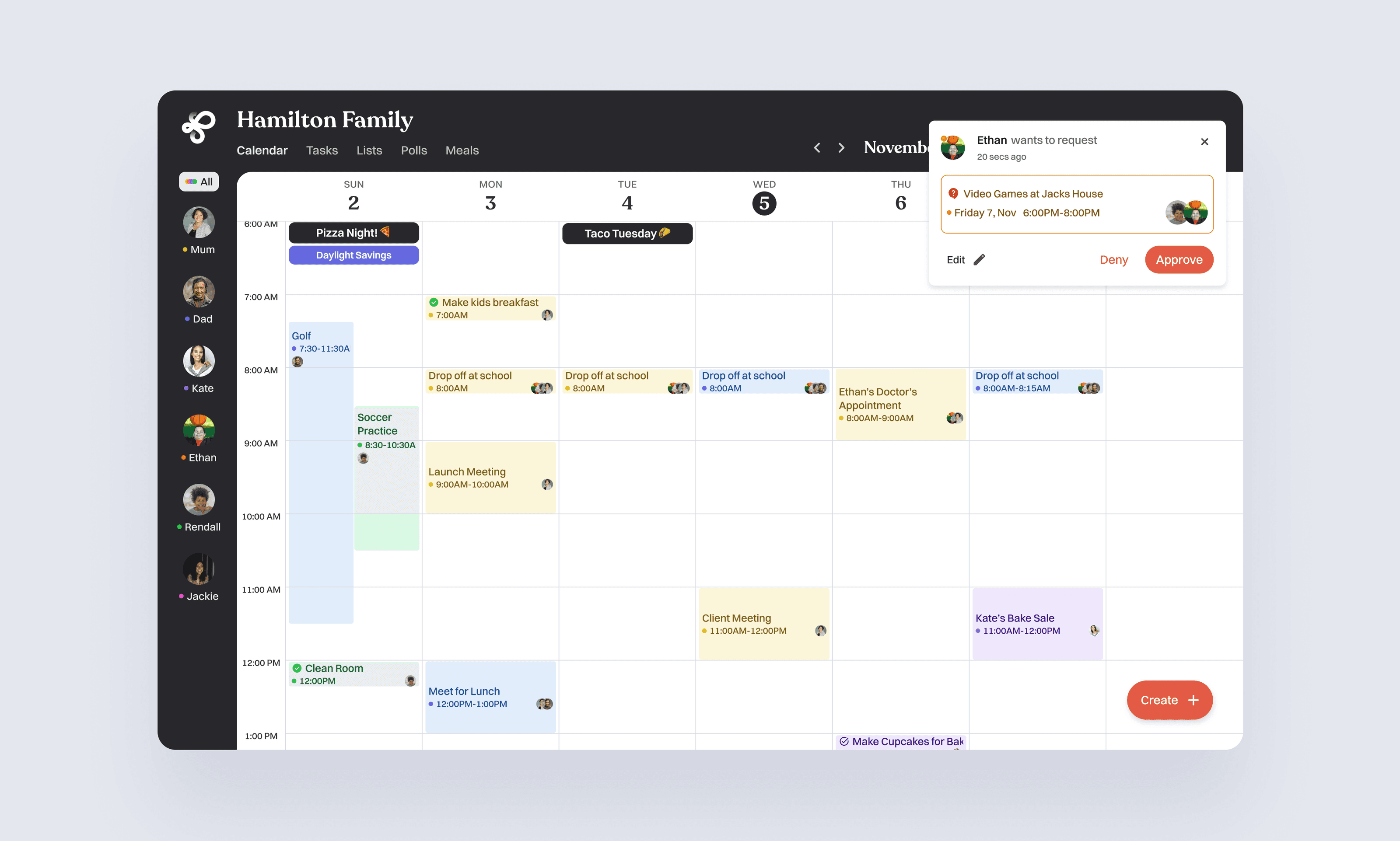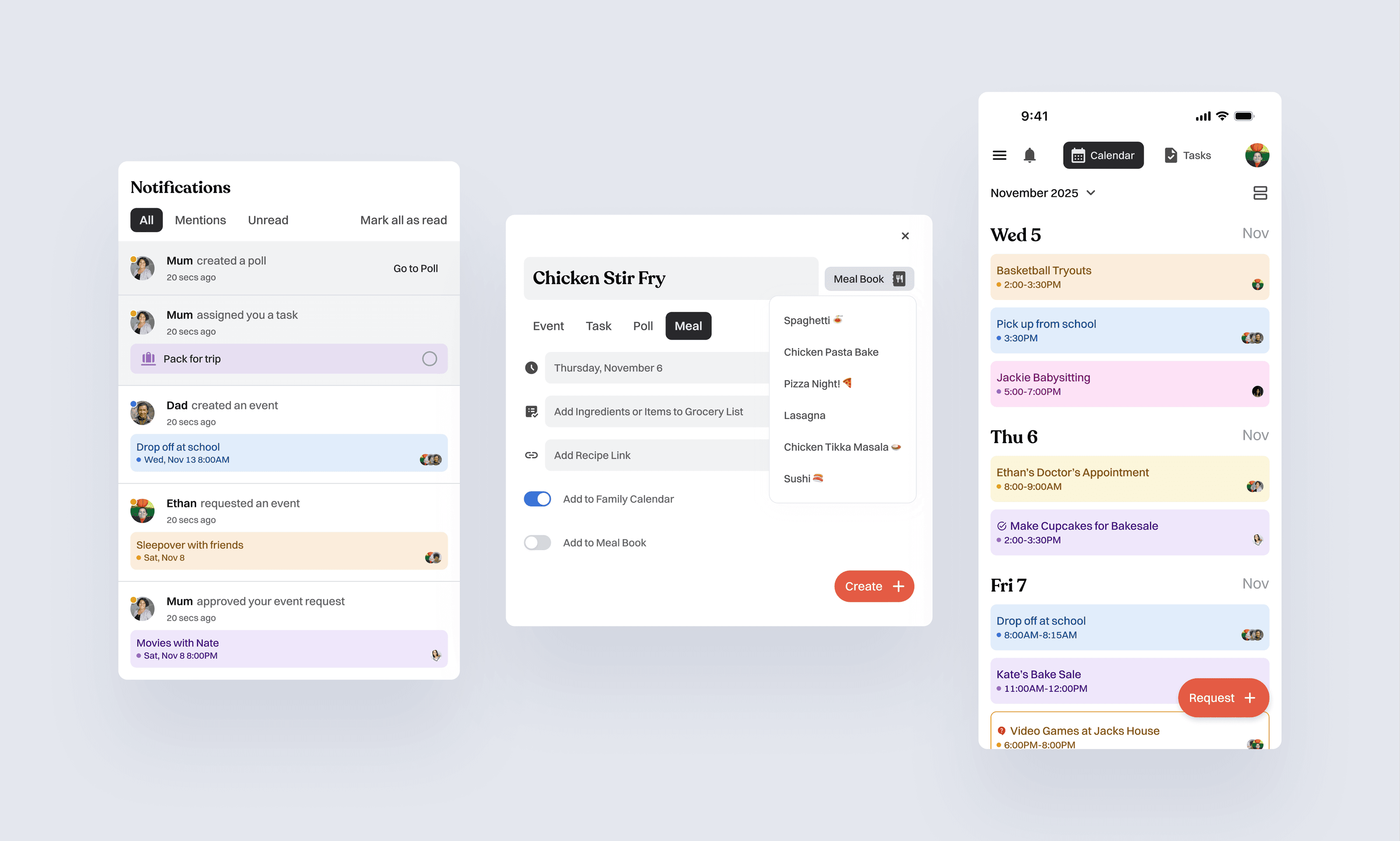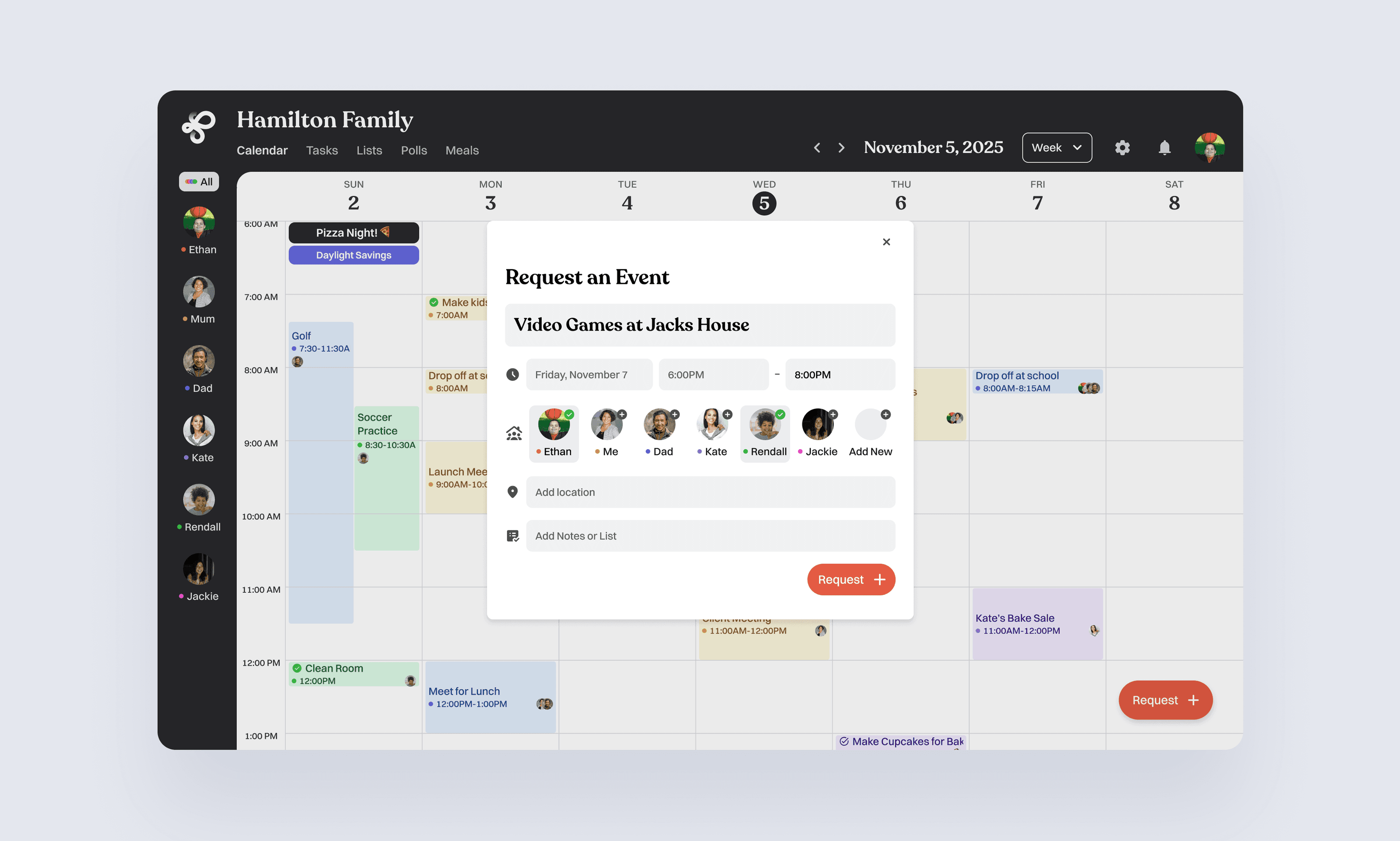 Kids can suggest activities such as sleepovers or outings. Requests appear as pending events until a parent reviews and approves them. This provides autonomy while preserving parental control.