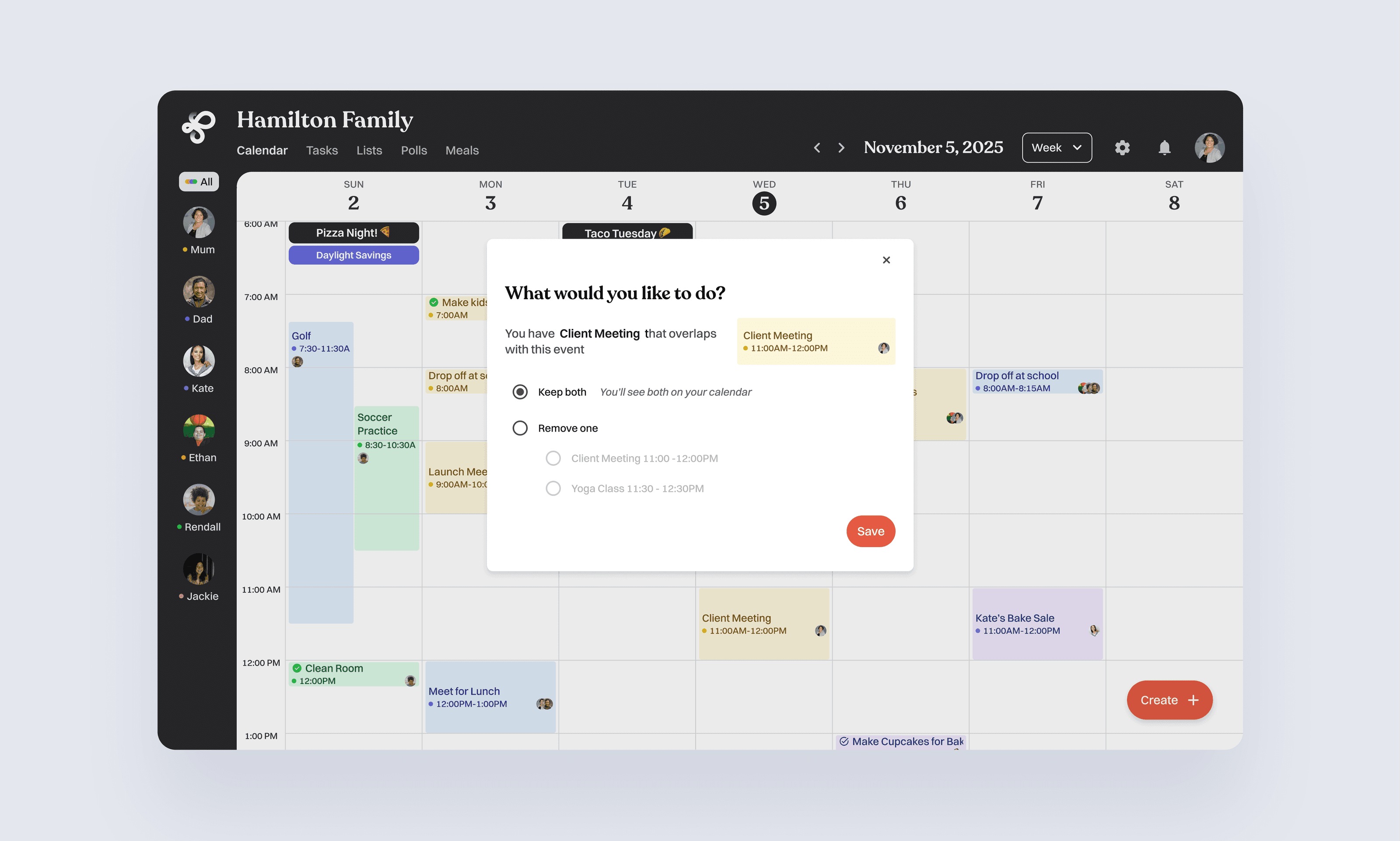 When events overlap, Loop flags the conflict and presents clear options: