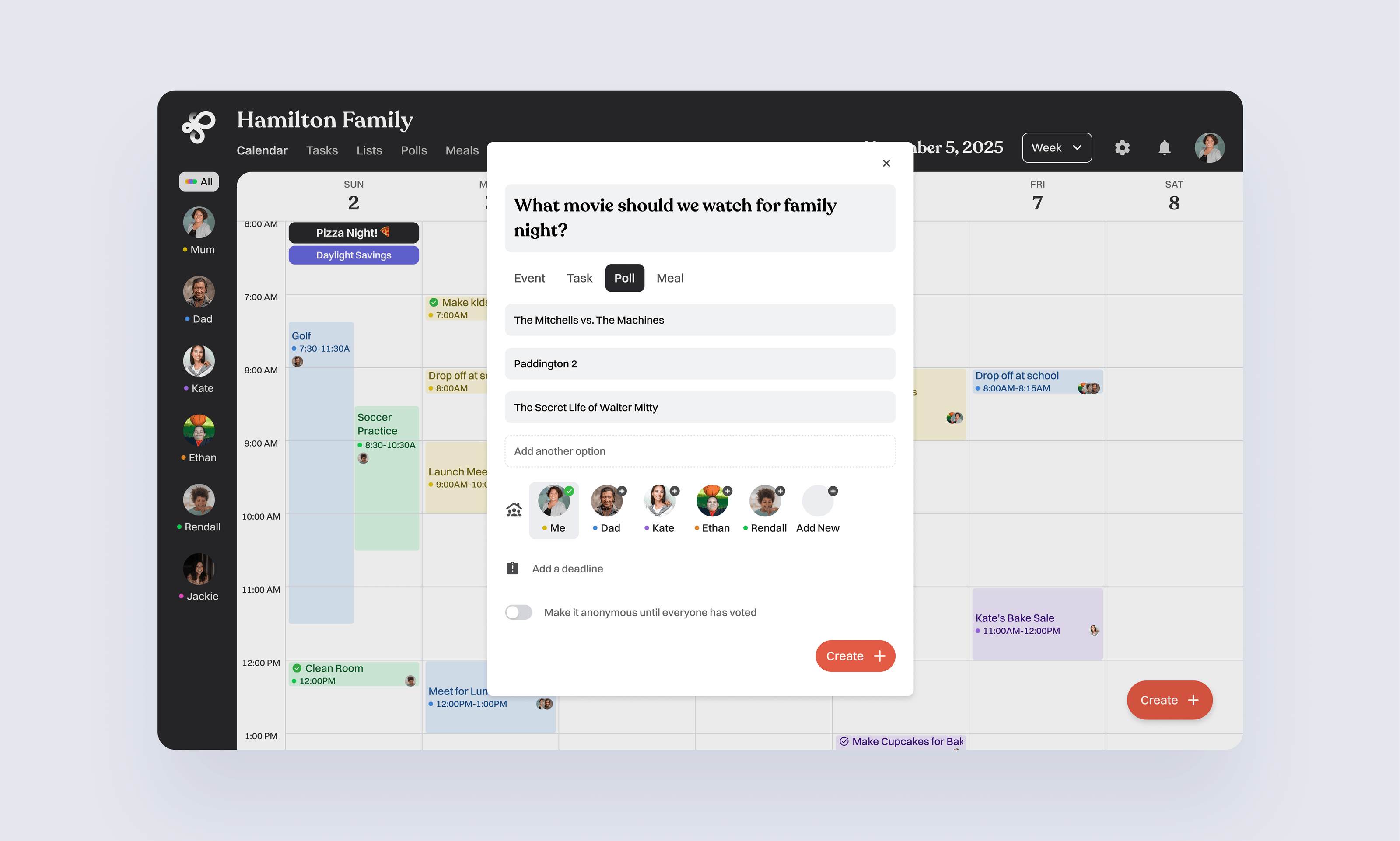 Parents can quickly add events and assign them to specific family members. This keeps everyone's schedule aligned while maintaining clarity around responsibility.